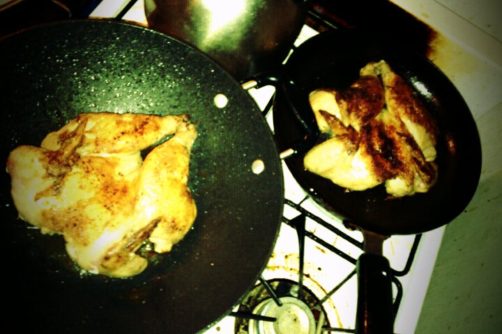The method is really for chicken pieces and works extremely well with thighs. However this last time I attempted it with splayed Cornish hens.